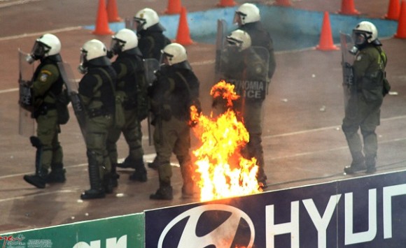 Μερίδα οπαδών του Παναθηναϊκού πέταξαν 2 βόμβες μολότοφ προς το Βαν της NOVA και στη συνέχεια συγκρούστηκαν με τις αστυνομικές δυνάμεις που έσπευσαν στο σημείο.